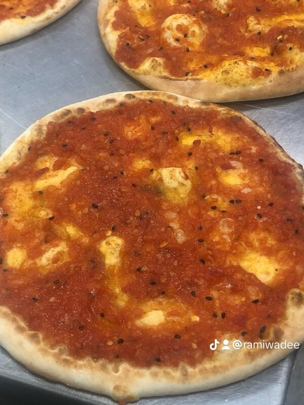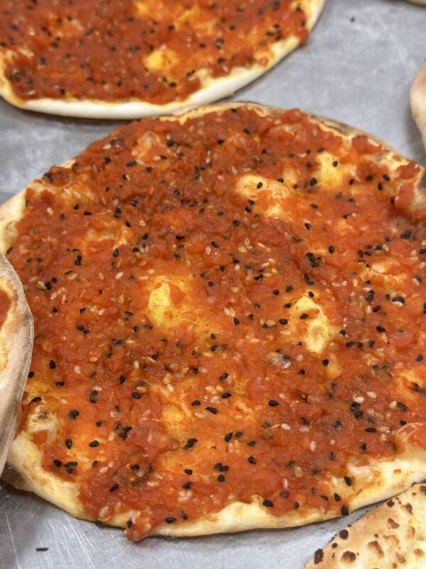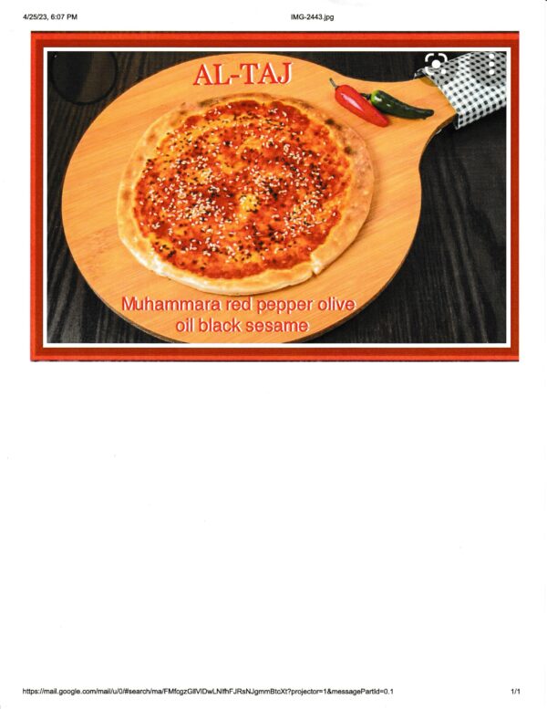 A savory favorite from the Levant. Our freshly baked flatbread is generously spread with rich Muhammara, a vibrant dip made from roasted red peppers, crushed onions , and tangy pomegranate molasses with black sesame seeds & olive oil . This classic topping delivers a complex flavor—sweet, savory, and mildly spiced—for a truly authentic experience.