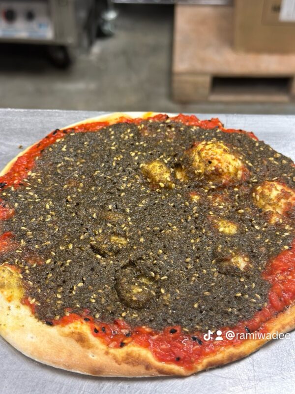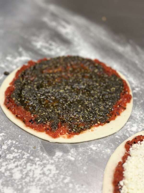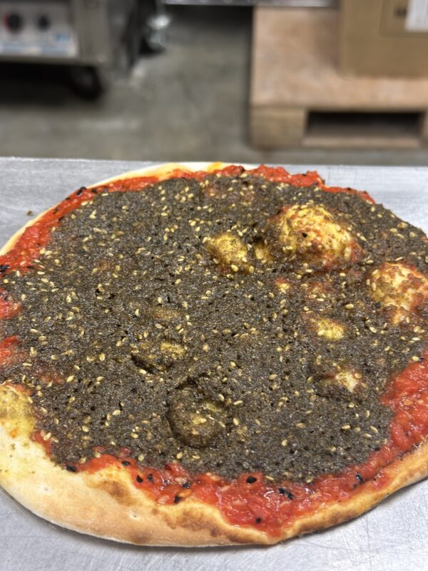 A savory marriage of two Levantine classics. Our freshly baked flatbread is topped with a flavorful combination of aromatic Za’atar and olive oil (thyme, sesame, sumac) on one side, and our rich, tangy Muhammara spread (roasted pepper ) on the other. A delightful harmony of earthy herbs and sweet-spicy richness in every bite.