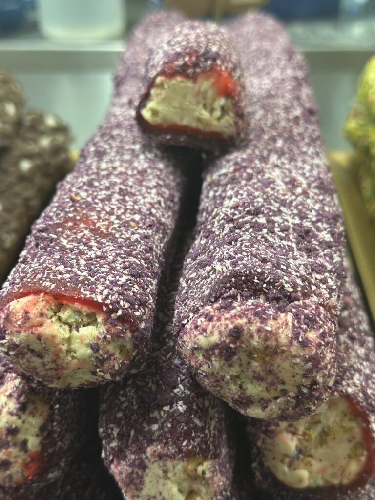 Blackberry Flavor Coated Turkisl Delight with Drop Chocolate and Pistachio
