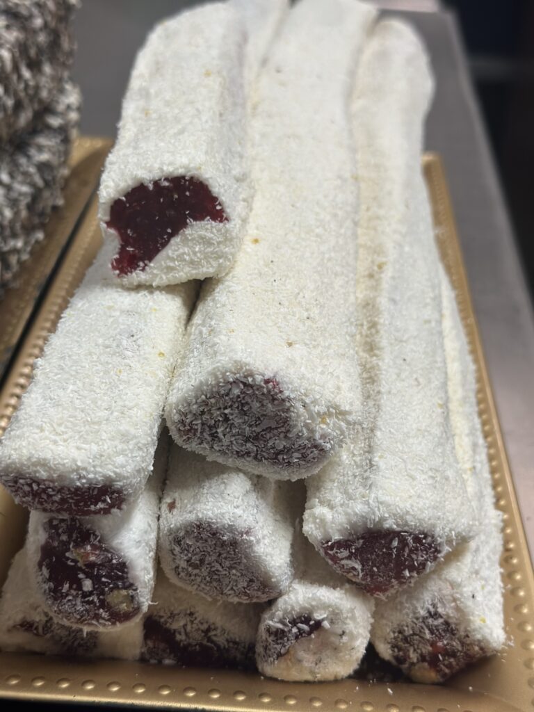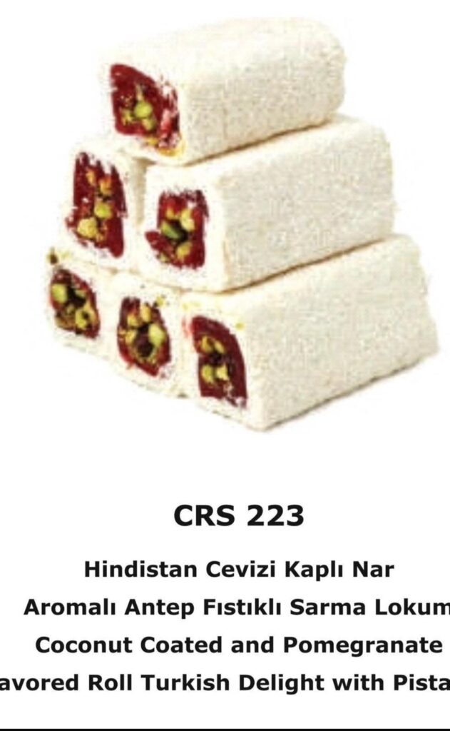 Coconut Coated and Pomegranate avored Roll Turkish Delight with Pistachio